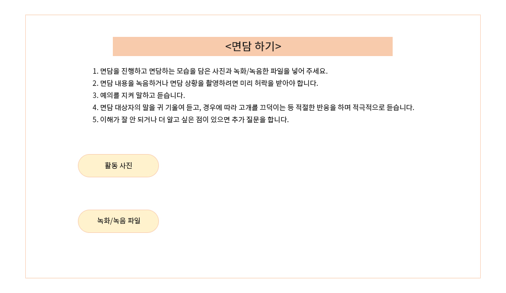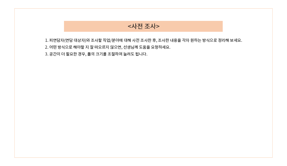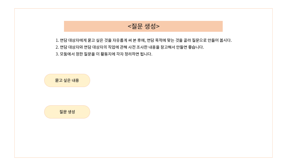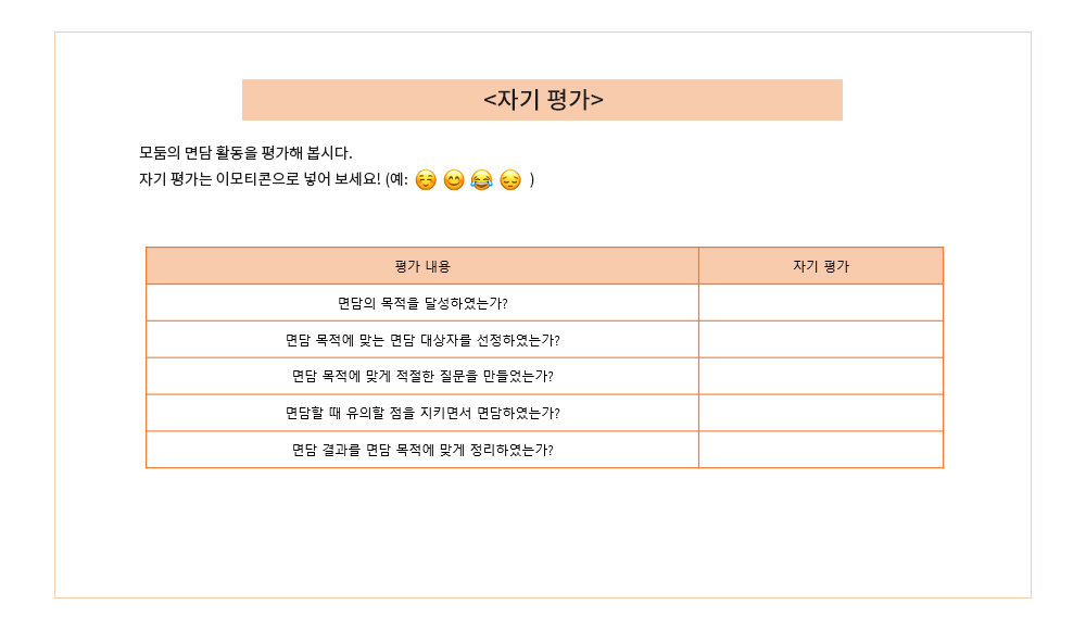 | 학습 목표 | 목적에 맞게 질문을 준비하여 면담할 수 있다. |