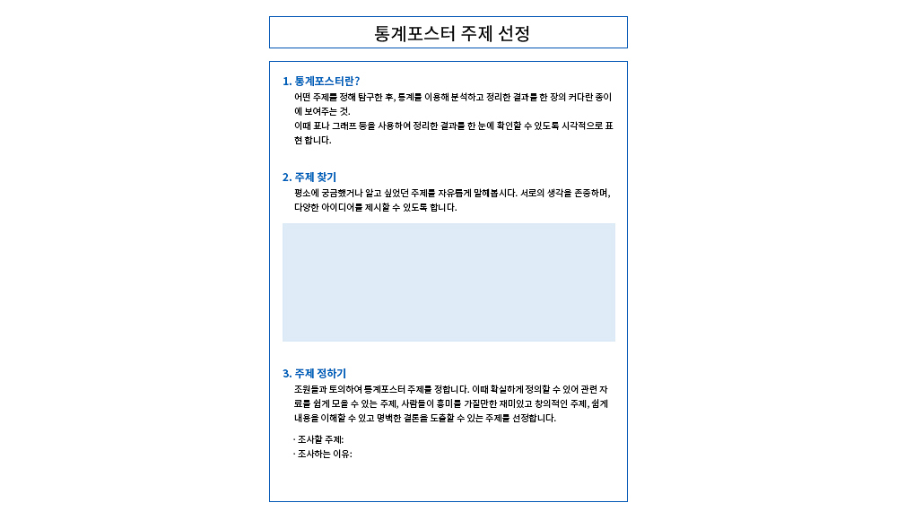 | 수업유형 | 문제해결형: 문제를 분석하고 자료를 수집, 분석하여 해결 방법을 도출할 수 있다. |
