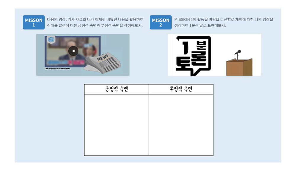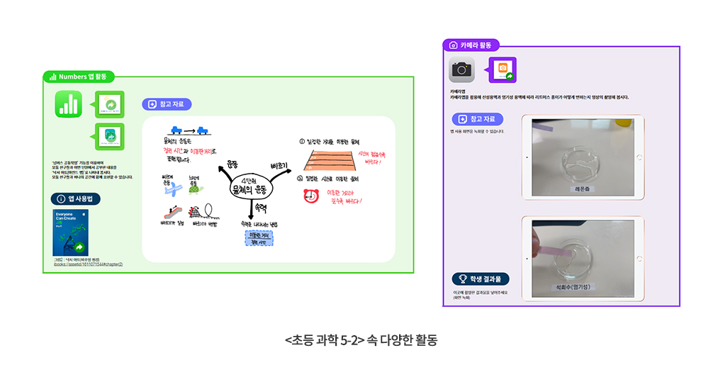 1. Keynote, Goodnote로 제작한 학습지를 통해 신항로 개척의 배경과 내용을 학습한다. 2. Numbers 앱을 통해 유럽 대륙의 변화를 주제로 비쥬얼 싱킹 활동을 실시한다. 3. Numbers 앱을 통해 피정복민의 삶을 잘 드러내주는 역튜브 썸네일을 제작한다. 4. Numbers 앱과 카메라를 활용하여 신항로 개척에 대한 나의 생각을 말과 글로 표현한다. |